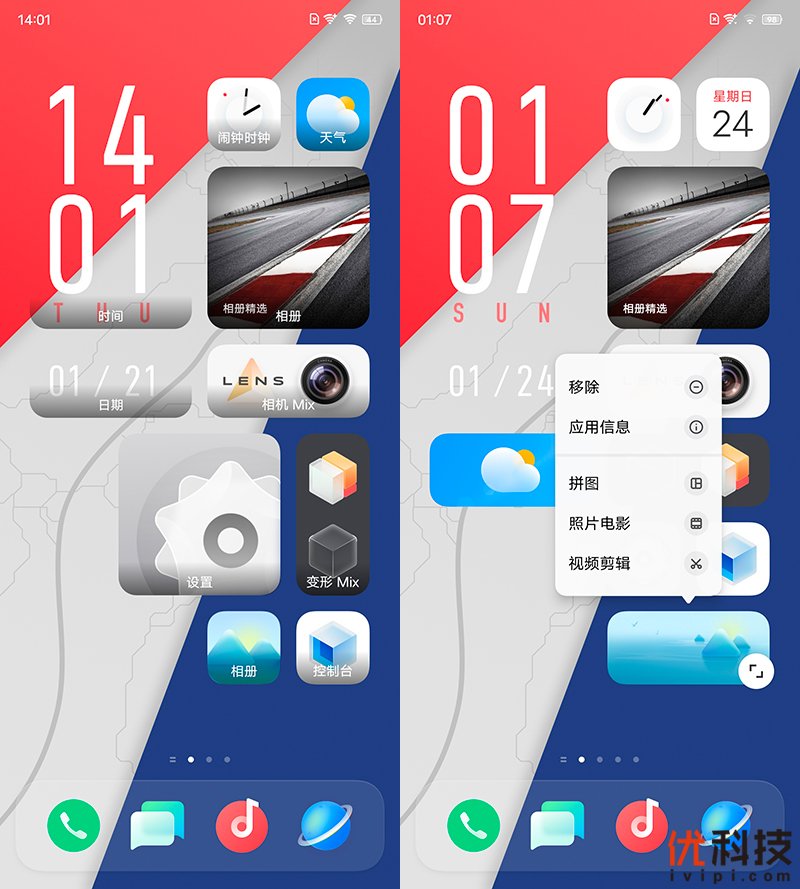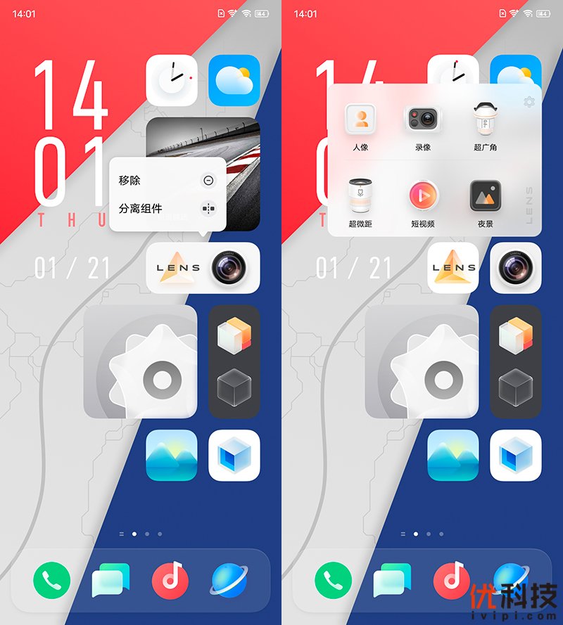 系统桌面原子组件除了大小调节还支持分离组件设计,长按组件可选是否分离操作,另外例如长按镜头包组件还弹出多种镜头模式图标选择,可以让用户更快捷进入相机模式。