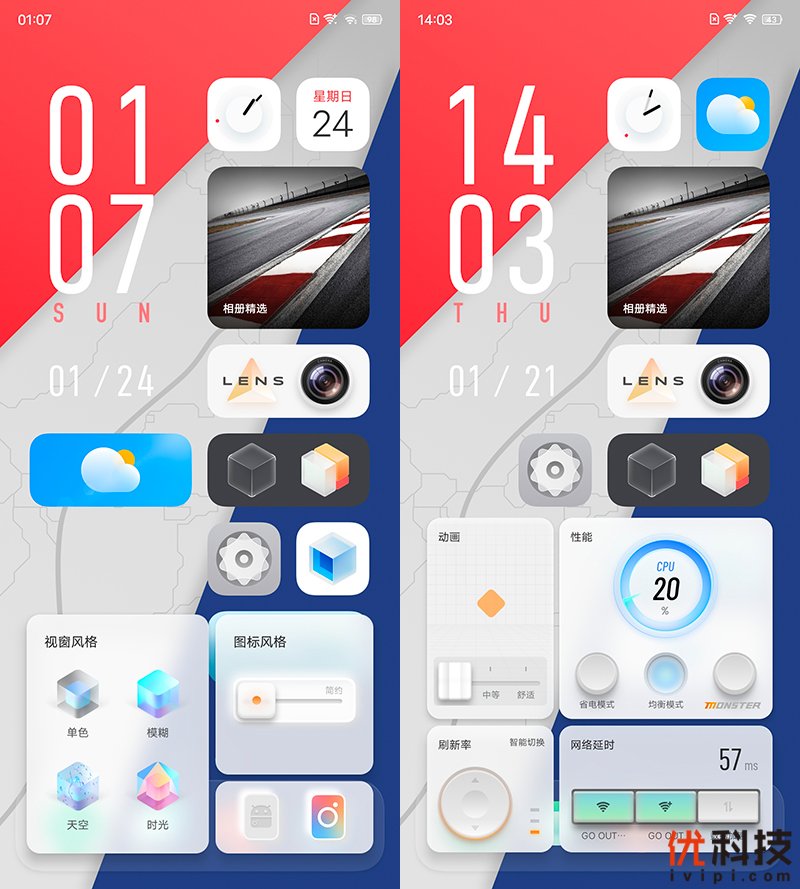 另外点击变形器组件则是可以呼出系统风格快捷控制视窗,在其中可选择视窗风格,其中视窗风格共有单色、模糊、天气和时光四种风格,而图标风格切换功能可实现系统默认图标在精致/简约、标准/开放这四种不同风格的切换,涵盖拟物、扁平、开放、封闭等不同效果。可以在OriginOS创新的系统和传统系统间一键切换,并且共享同一套数据,不会占用多余空间。而控制台则是iQOO独占功能,开启控制台功能则可快速调节性能模式、动画效果、屏幕刷新率、屏幕显示环境以及网络设置等,一键快速操控手机。