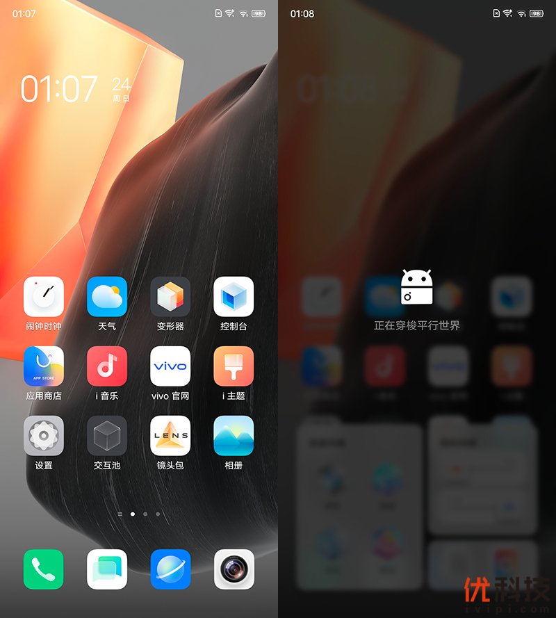 当用户选择切换平行世界回到传统系统UI页面之后,之前的原子组件将会转化为单独的图标按键,并且功能操作依旧保留,同时依旧支持组件合并及分离功能。需要说明的是,之前的老用户若想要继续使用之前的系统主题则需要切换为传统UI界面。至于系统切换功能也是非常的炫酷,当选择切换之后系统页面将变为模糊状态,屏幕中间则提示“正在穿梭平行世界”的字样,非常的科幻。