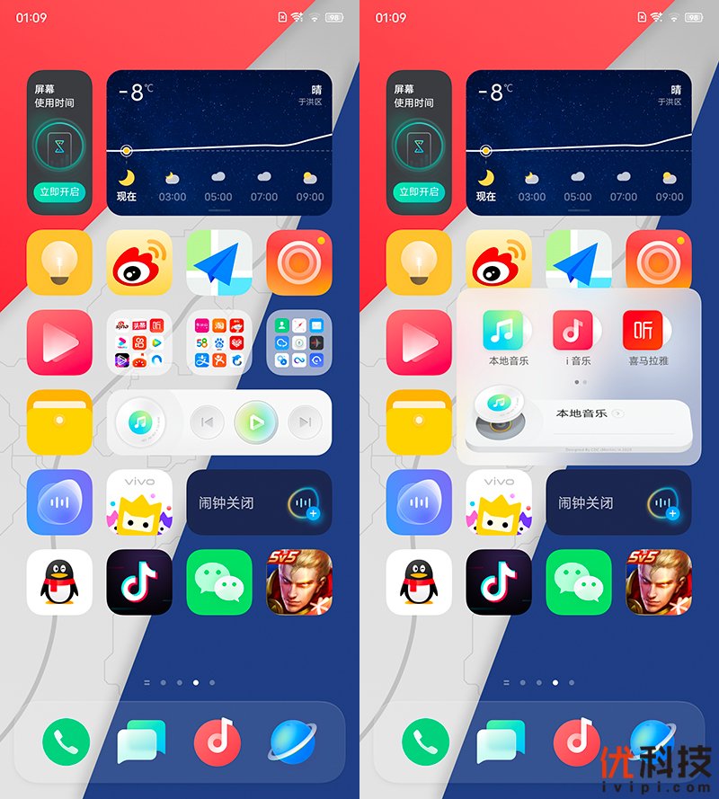 再回来聊聊OriginOS for iQOO桌面图标,OringinOS为众多三方图标重绘适合于华容网格的形式,每颗图标都有三种样式的呈现,并不是简单的放大与缩小,而是做了适合于尺寸的重绘,让第三方应用图标和桌面原子组件组合更加的融洽。另外全新的原子随身听采用了平台级整合设计,可以无缝切换本地音乐、i音乐、QQ音乐和喜马拉雅等不同播放器的内容,直接播放而不再需要进入不同的app,从而享受最纯粹的声音。