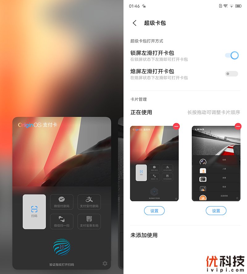 超级卡包功能的加入让手机使用起来更加的方便,用户可在任意界面(包括息屏界面),从界面右侧下方边缘向左滑出超级卡包—支付卡,让用户在任何场景下都可以单手快速完成支付。支付卡中整合用户最常用的微信、支付宝中的乘车码、二维码以及扫码入口,并且同时显示指纹界面,选择任意方式后在卡片上手指按下即可进入相应功能。同时,还提供多种卡包主题风格供用户选择。