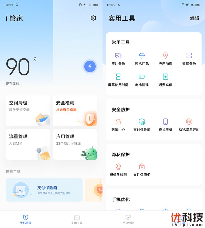 与此同时系统内的i管家功能也是非常的全面,具备空间清理、安全检测、流量管理以及应用管理功能,同时还支持多种常用工具以及安全防护、隐私保护以及多项手机优化功能,让手机适中保持最佳状态。