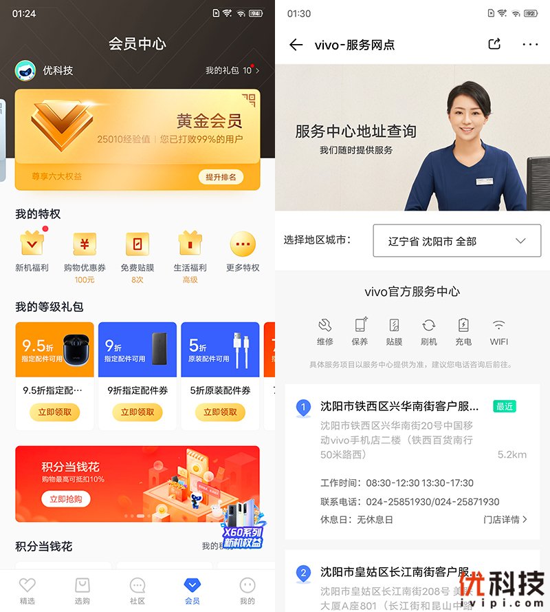 在系统内的vivo官网程序中,用户可以更方便地选购vivo产品,同时在会员选项中还提供了多项会员服务,例如每年至少4次的免费贴膜,并且程序中还提供了各地的vivo售后服务中心地址以及联系方式。同时在程序内还具备了电子保修卡以及多项特权功能。