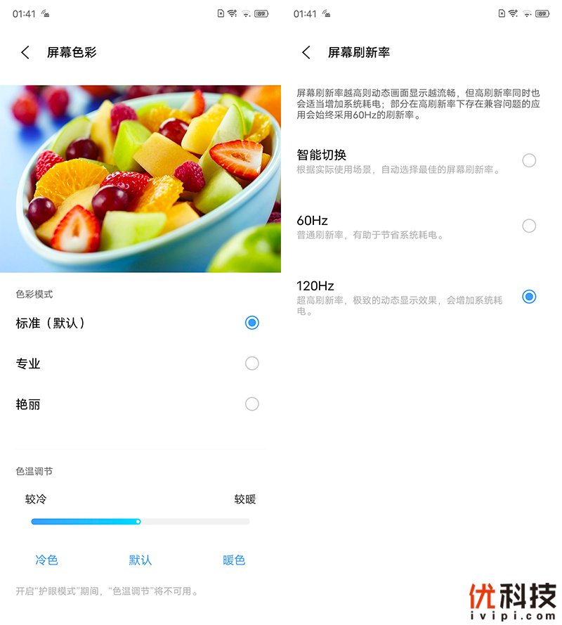 另外在系统内用户还可以选择屏幕显示色彩风格,具有标准、专业、艳丽三种模式可选,同时还可以手动调节屏幕的色温效果。并且可以手动选择屏幕刷新率,用户可以根据自己的使用场景和功耗要求而设定,同时还可以选择智能切换选项,自动选择最佳的屏幕刷新率。