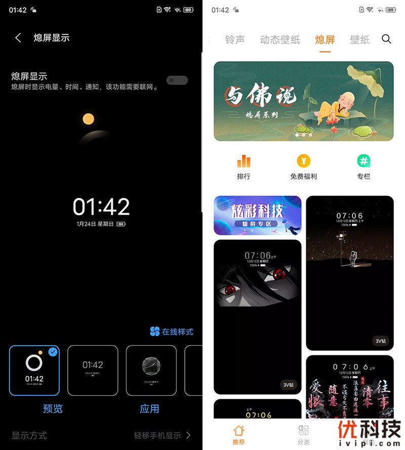 同时得益于搭载AMOLED显示屏的特性,该机还支持熄屏显示功能,除了在系统内默认的多款主题,还支持在主题市场下载更多个性化熄屏显示效果。