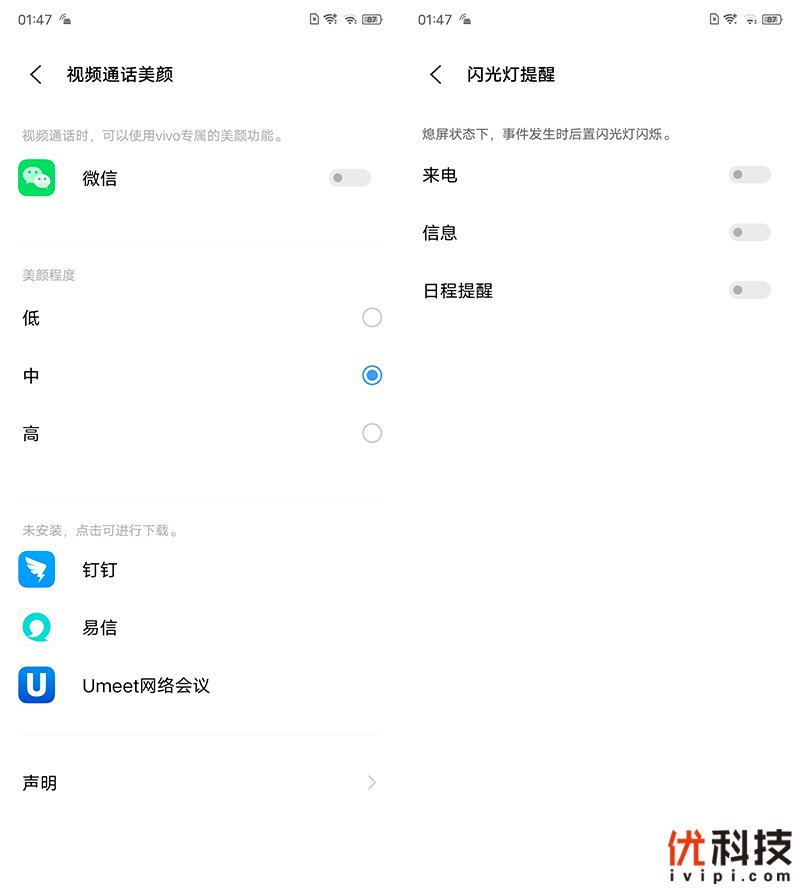 在视频通话方面,系统内还支持视频通话美颜功能,具备多档可调,同时支持的应用也是非常的全面,另外用户还可以设定闪光灯提醒功能,包括来点、信息以及日程都可以触发闪光灯闪烁提醒。