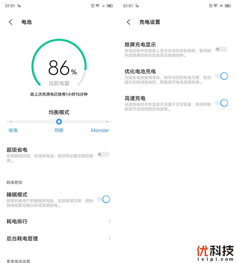 在系统的电池选项中用户可以设定手机的性能模式,并且可以实时查看系统程序的电量消耗。还可以设定息屏充电以及优化电池充电等实用功能。并且用户可以根据自身需求开启高速充电选项,开启后充电时手机温度会略有升高,但属于正常现象,无需担心。