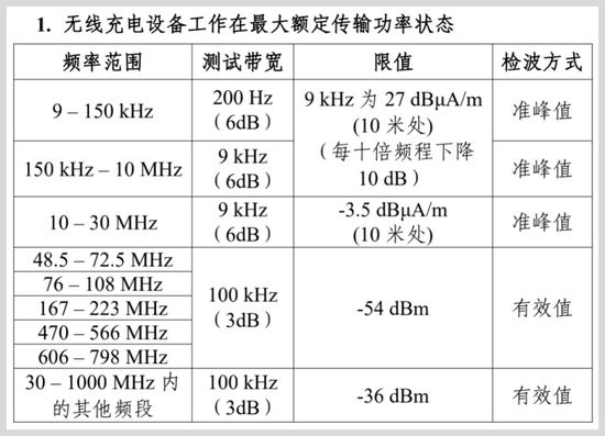 其次,意见稿分别规定了无线充电的频率和功率。