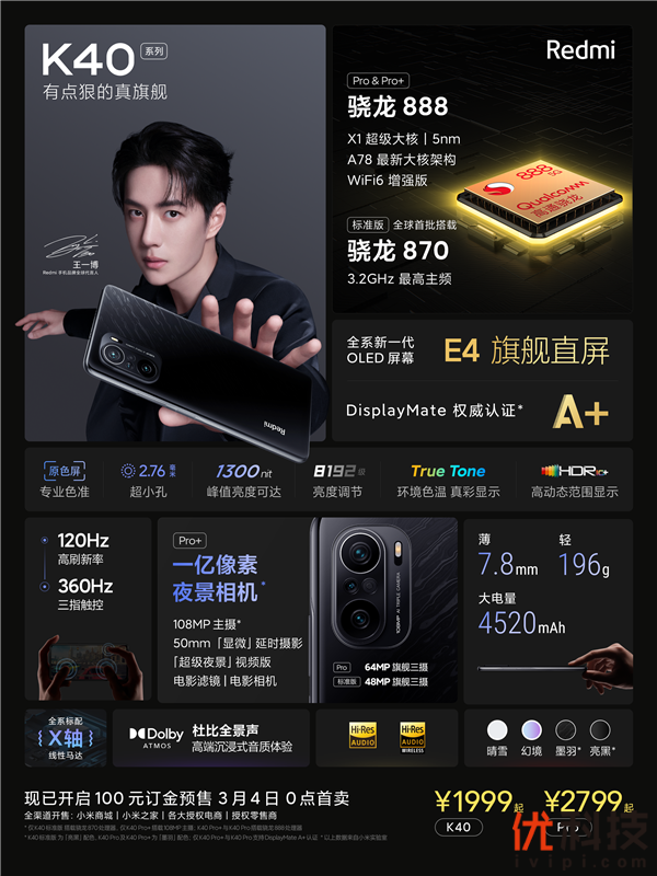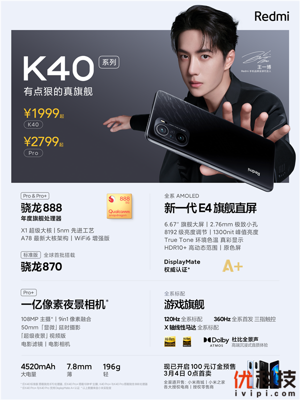 Redmi K40和K40 Pro已在小米商城、小米有品、京东、天猫、苏宁易购、小米之家、小米授权店等渠道开启100元订金预售,3月4日0时正式开卖。K40 Pro+将在3月下旬开售。