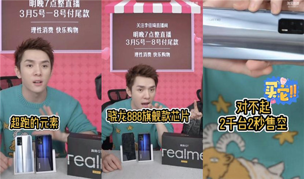 自公布价格之后,真我GT受到了极高的关注度。在发布会当晚,直播界一哥李佳琦便在直播间上架了新品真我GT,仅用2秒钟预售便超过了2000台,创造了直播带货手机品类的“销售神话”;全网预约更是突破200万,尚未发售就已成为爆款,进一步印证了年轻消费者对realme品牌理念与实力的认可。
