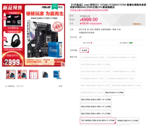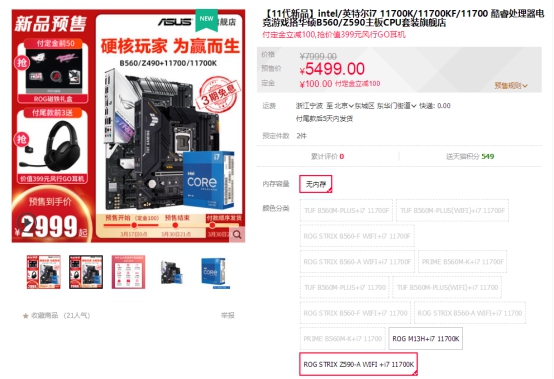 此外,天猫商城还有搭配i7-11700K的板U套装有售,预售价格6099,付定金立减100元,享3期免息,还有机会抢价值399元的风行GO耳机。