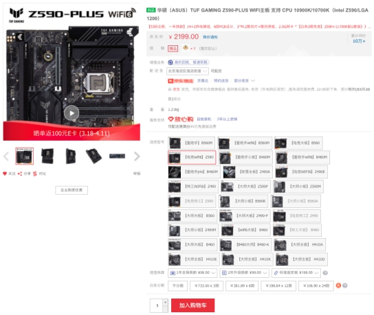 TUF GAMING Z590-PLUS WIFI主板主板属于TUF GAMING电竞特工系列,专为年轻玩家设计。该板采用ATX版型设计,其外观采用全新电竞特工LOGO设计,利落的线条和黑色裂甲设计彰显无限战力,硬派形象一目了然。京东售价2199元,4月11日前晒单返100元E卡,还有3期免息政策。