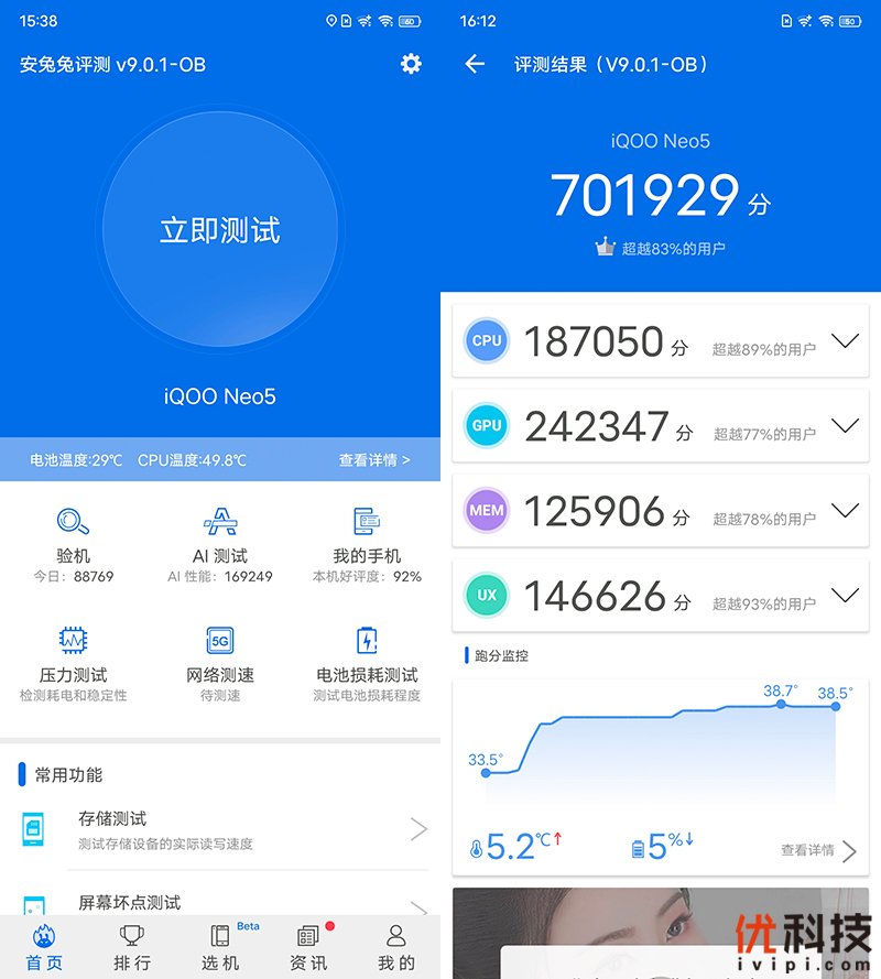 下面就到了每次体验必不可少的跑分环节了,虽然跑分并不能反映一款手机的真实体验表现,但是也可以给用户一定的参考。下面笔者就用目前市面上比较流行的几款跑分软件对iQOO Neo5进行测试。