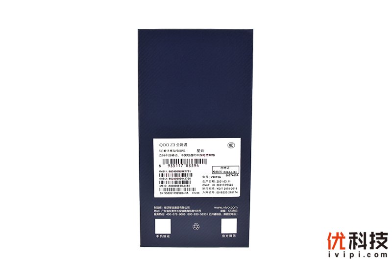 包装背面则是贴有iQOO Z3相关配置信息的贴纸,本次我拿到的为8GB+256GB的星云配色版本。