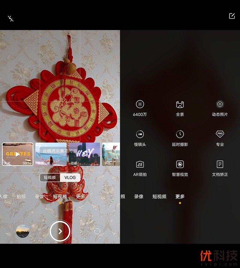 至于取景界面设计方面也是很容易上手,在拍照页面中上方分别为闪光灯控制、HDR控制、AI场景优化、微距以及功能设置。而下方则是焦段选择和滤镜选择,至于底部则是相机模式选择,默认状态下分别为夜景、人像、拍照、录像、短视频以及更多选项功能,同时用户还可以自定义相机模式排列,自由度还是非常高的。