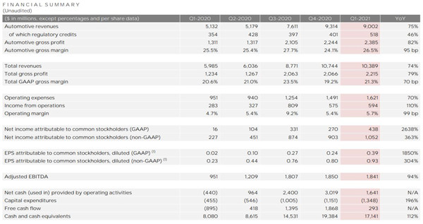 营收方面:2021年第一季度,特斯拉总营收为103.89亿美元,与去年同期的59.85亿美元相比增长74%。