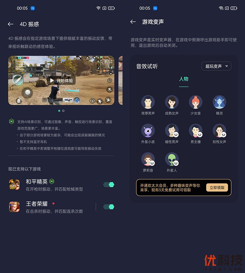 另外还得益于Tactile Engine 线性马达以及Dolby Atoms 立体双扬声器的加持,该机还支持4D振感功能,开启后在游戏中会随着游戏的清洁而产生震动,让游戏体验更加的逼真。同时还具备游戏变声功能,具备多种人物音效选择。