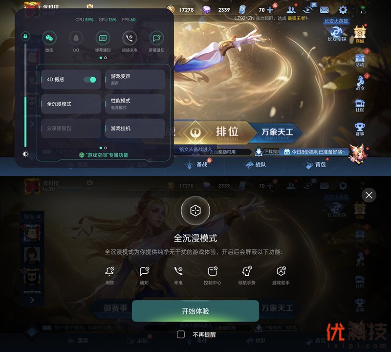 而在游戏页面滑动屏幕的左上角即可呼出游戏助手,游戏助手的功能也是非常的全面,不仅支持屏蔽消息和拒接来电,还显示手机的实时运行状态,另外还支持全沉浸模式,开启后将会屏蔽闹铃、通知、来电、控制中心、导航手势以及游戏助手。