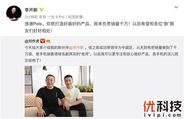 一加手机CEO兼创始人刘作虎发布微博称:“给大家介绍我的新伙伴@李开新 。他之前带领华为中国区,从无到有把销量做到了千万级,是手机销售领域名副其实的“老将”。以后我可以更专注和放心做好产品,卖手机的活儿就交给他了!”随即李开新发布微博回应:“感谢Pete。你就打造好最好的产品,我来负责销量千万!以后希望和各位“新”朋友们好好相处!”凭借其丰富的销售经验,李开新的加入将帮助一加在中国市场获取更大的市场份额,离“销量千万”的目标更近一步。