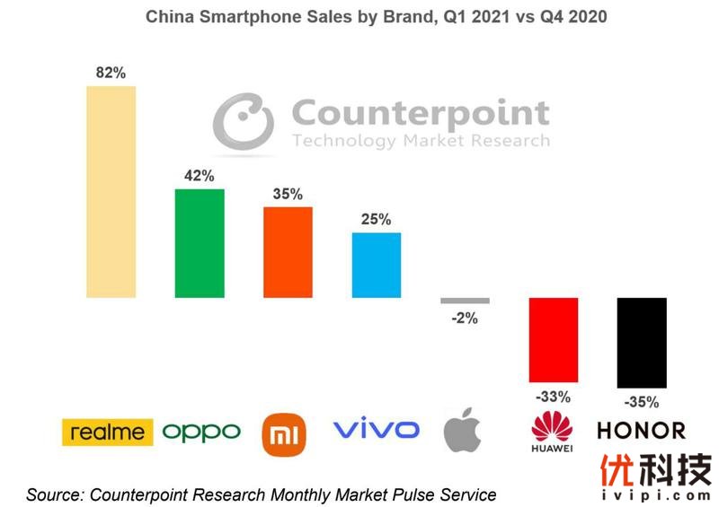 2021年5月21日—中国· 深圳—全球成长最快智能手机品牌realme 真我发布最新消息,据Counterpoint Research最新的统计数据显示,realme在2021年Q1销量环比增长82%,同比大增451%,是中国市场Q1增速第一的手机品牌。