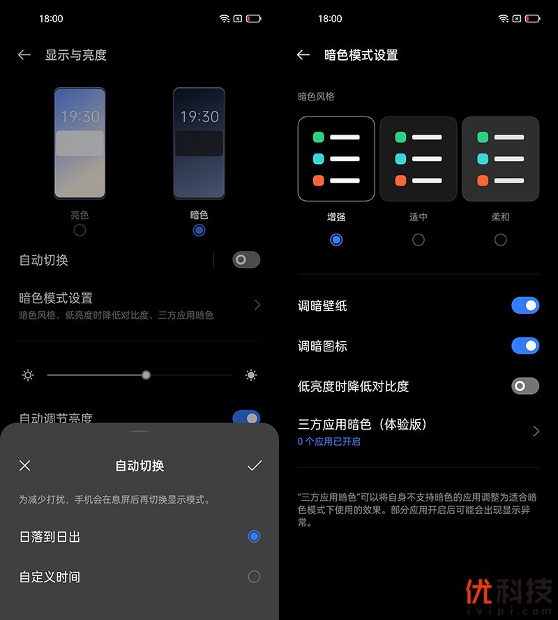 在系统显示设置方面,具备暗色模式用户可以手动设定暗色模式开启时间段,同时可以选择单独应用开启暗色模式,细节方面更加的个性化。另外包括图标和壁纸以及第三方应用均可以体验暗色版模式,让护眼更加的彻底。