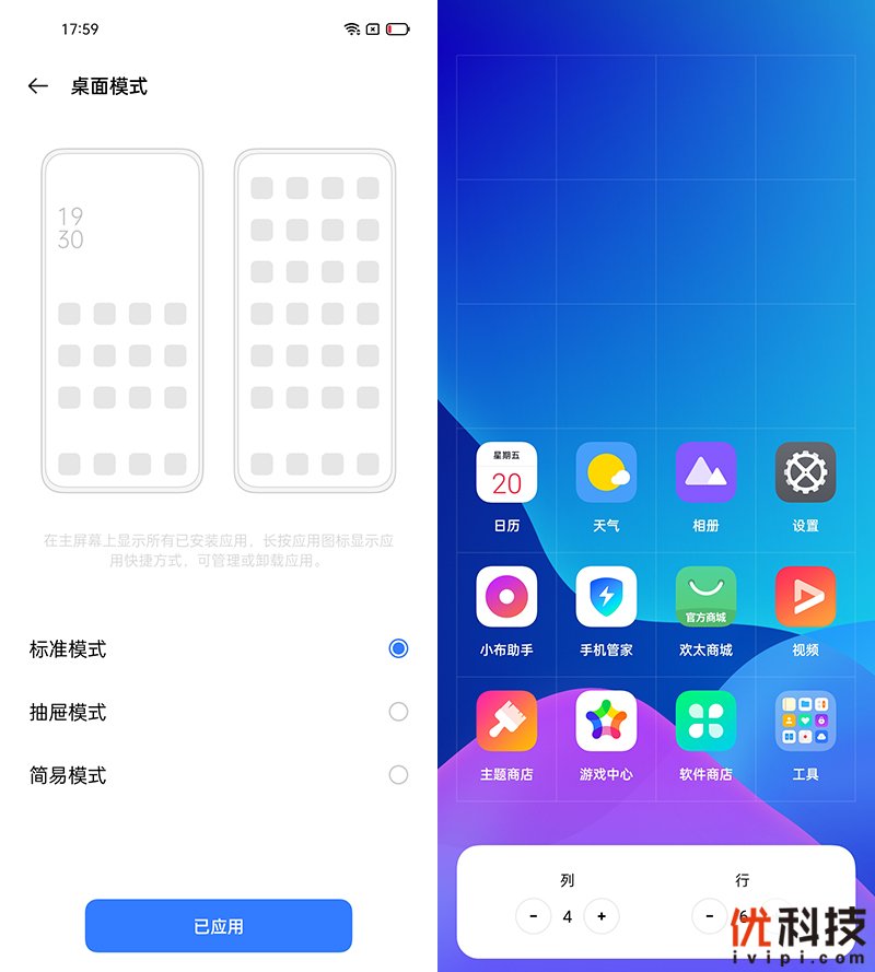 关于桌面模式布局用户可以选择标准模式或是抽屉模式以及简易模式,三种模式适合不同喜好的用户。并且桌面图标布局还可以选择4×6或者5×6等布局模式,适合不同用户的操控习惯。
