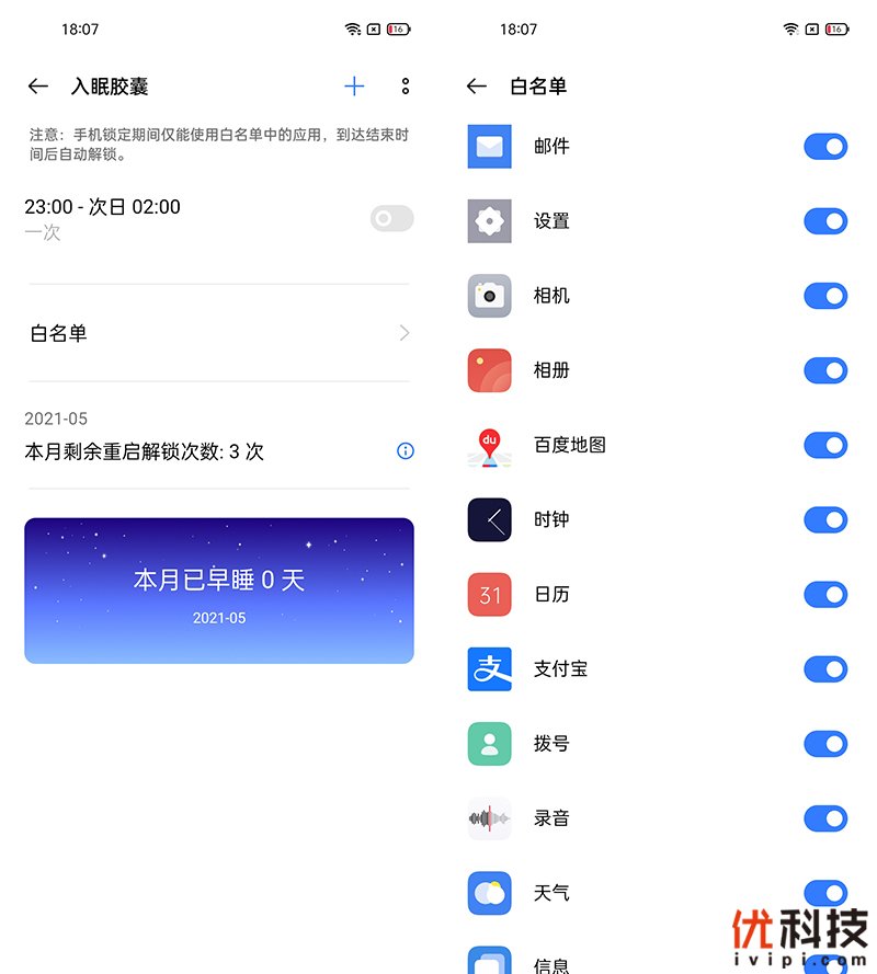 至于新增的入眠胶囊功能则是定时锁定手机,让用户不再被过多的资讯消息推送影响睡眠质量,该功能支持定时开启,同时可以设定程序白名单,在锁定时间内仅白名单程序可以使用。