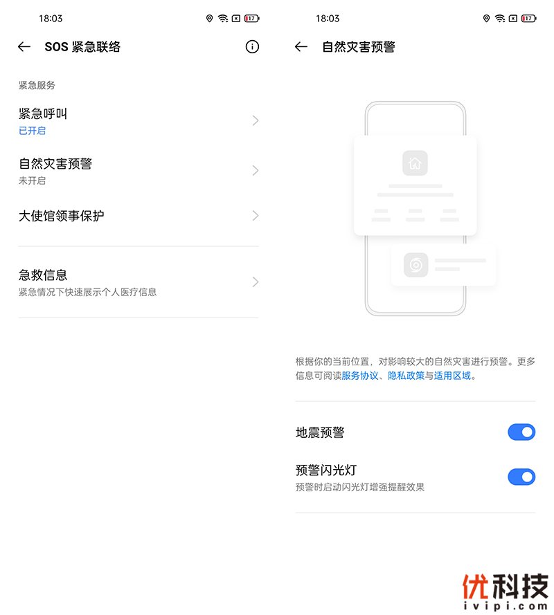 系统内还内置了SOS紧急联络功能,并且支持自然灾害预警,例如地震预警就可以提前数秒通知用户以实现人身和财产的保全。另外还支持大使馆领事保护选项,至于紧急呼叫功能也是非常的实用,连按5次电源键即可开启紧急呼叫功能,开启后手机将自动拨打紧急联络号码,同时还支持自动发送带有用户实时位置信息的短息通知。
