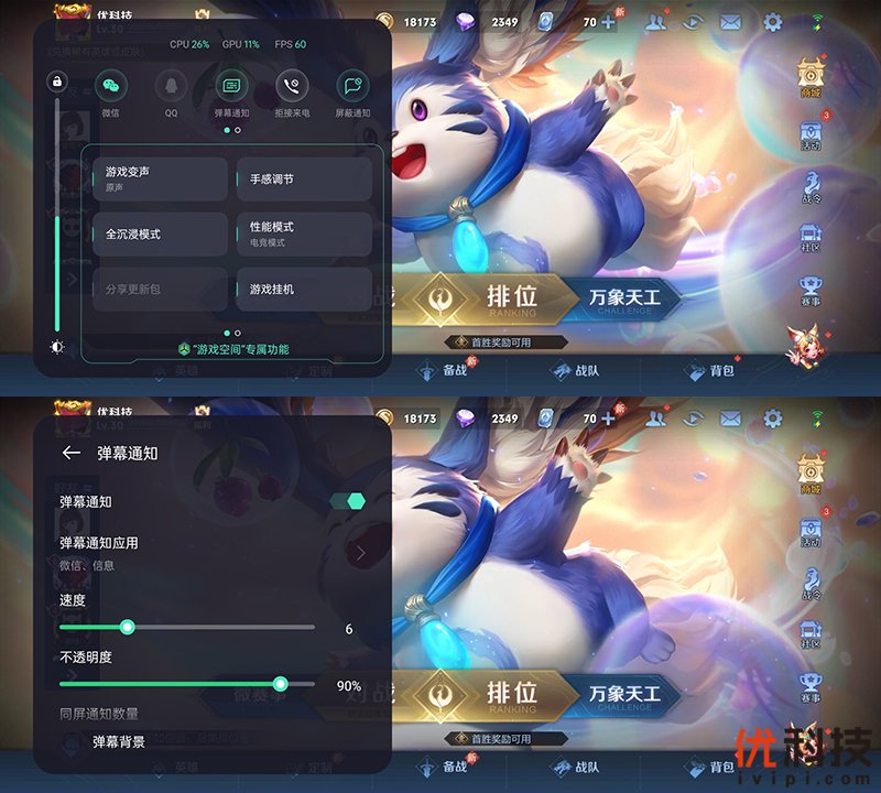 在游戏页面滑动屏幕的左上角即可呼出游戏助手,游戏助手的功能也是非常的全面,不仅支持屏蔽消息和拒接来电,还显示手机的实时运行状态,另外支持的弹幕通知也是非常的有趣,用户也可以手动设定速度以及透明度和弹幕背景。