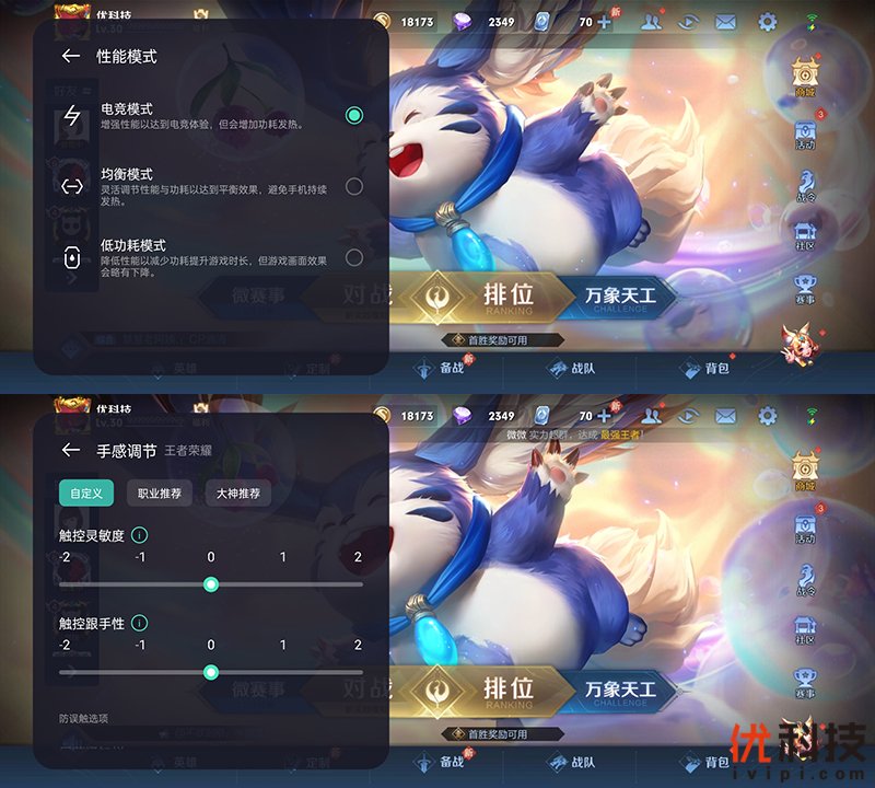 用户可以在游戏助手中选择手机的性能模式,具备电竞模式、均衡模式、低功耗模式,同时还支持手感调节功能,用户可以手动调节触控灵敏度以及触控跟手度,同时还提供了职业推荐以及大神推荐等选项。