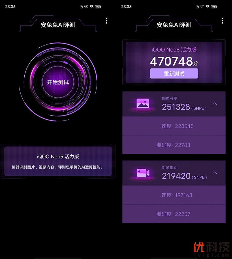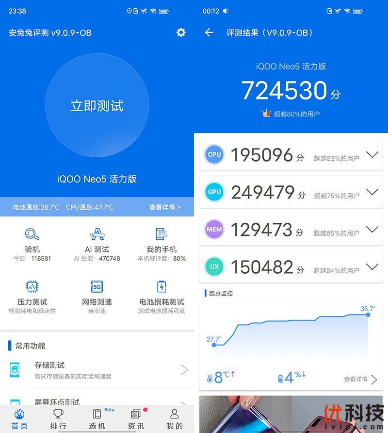 下面就到了每次体验必不可少的跑分环节了,虽然跑分并不能反映一款手机的真实体验表现,但是也可以给用户一定的参考。下面笔者就用目前市面上比较流行的几款跑分软件对iQOO Neo5 活力版进行测试。