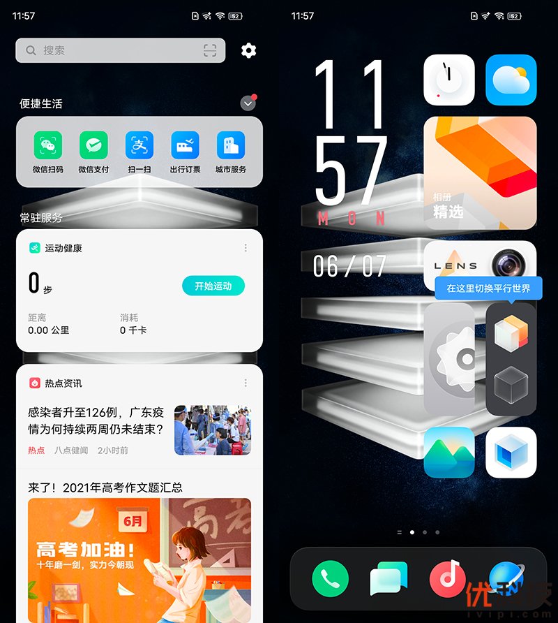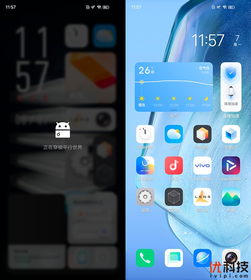 另外,若是用户较为怀念传统UI页面也可以通过一键切换来实现,点击变形器中的一键切换即可切换,当选择切换之后系统页面将变为模糊状态,屏幕中间则提示“正在穿梭平行世界”的字样,非常的科幻。在OriginOS创新的系统和传统系统间一键切换,并且共享同一套数据,不会占用多余空间。