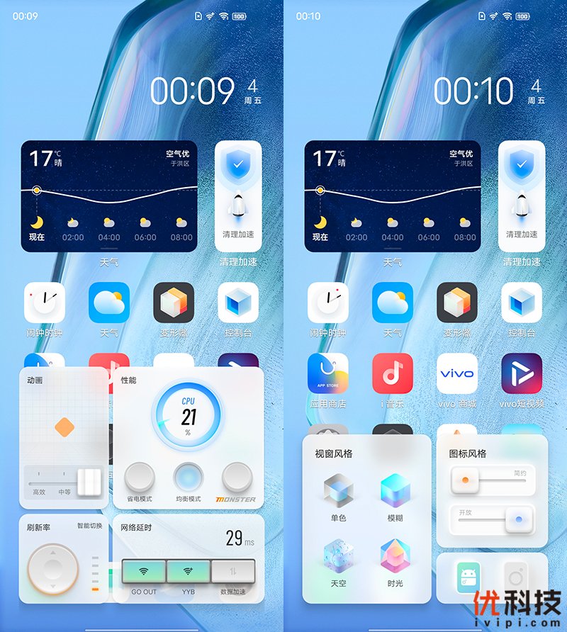 细节设计方面,点击变形器组件则是可以呼出系统风格快捷控制视窗,在其中可选择视窗风格,其中视窗风格共有单色、模糊、天气和时光四种风格,而图标风格切换功能可实现系统默认图标在精致/简约、标准/开放这四种不同风格的切换,涵盖拟物、扁平、开放、封闭等不同效果。而控制台则是iQOO独占功能,开启控制台功能则可快速调节性能模式、动画效果、屏幕刷新率、屏幕显示环境以及网络设置等,一键快速操控手机。
