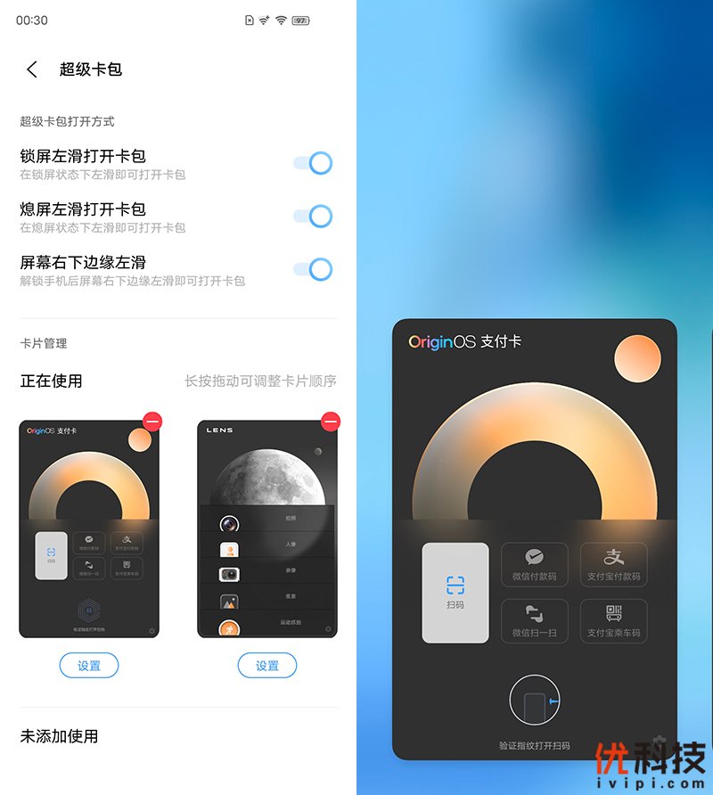 超级卡包功能的加入让手机使用起来更加的方便,用户可在任意界面(包括息屏界面),从界面右侧下方边缘向左滑出超级卡包—支付卡,让用户在任何场景下都可以单手快速完成支付。支付卡中整合用户最常用的微信、支付宝中的乘车码、二维码以及扫码入口,并且同时显示指纹界面,选择任意方式后在卡片上手指按下即可进入相应功能。