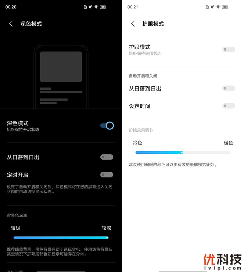 虽然iQOO Neo5 活力版搭载了LCD屏幕,但依旧支持深色模式,其中深色模式也支持定时开启,并可以手动调节深色模式的色彩深度。同时还支持全局护眼功能,用户可以定时开启,例如可以选择在夜晚来临之前自动开启全局护眼以保护视力。