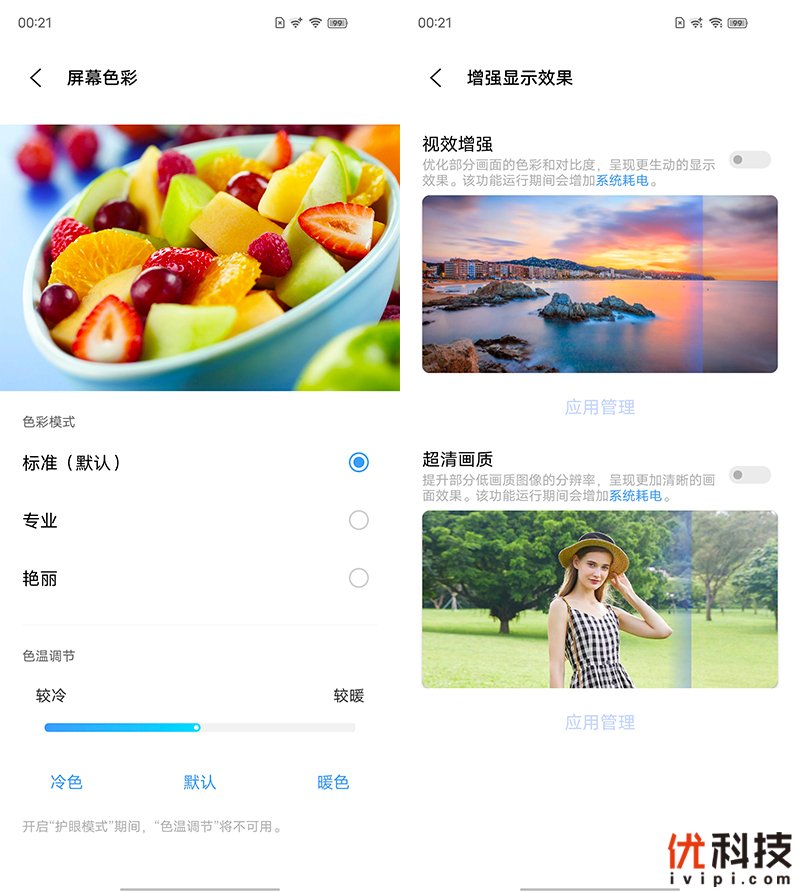 至于屏幕色彩方面,系统内用户还可以选择屏幕显示色彩风格,具有标准、专业、艳丽三种模式可选,同时还可以手动调节屏幕的色温效果。而超清画质功能也可以手动开启,开启之后可以提升部分低画质图像的分辨率,呈现更加清晰的画面效果。至于视效增强功能则是可以提升画面的色彩和对比度,显示更加生动的效果。