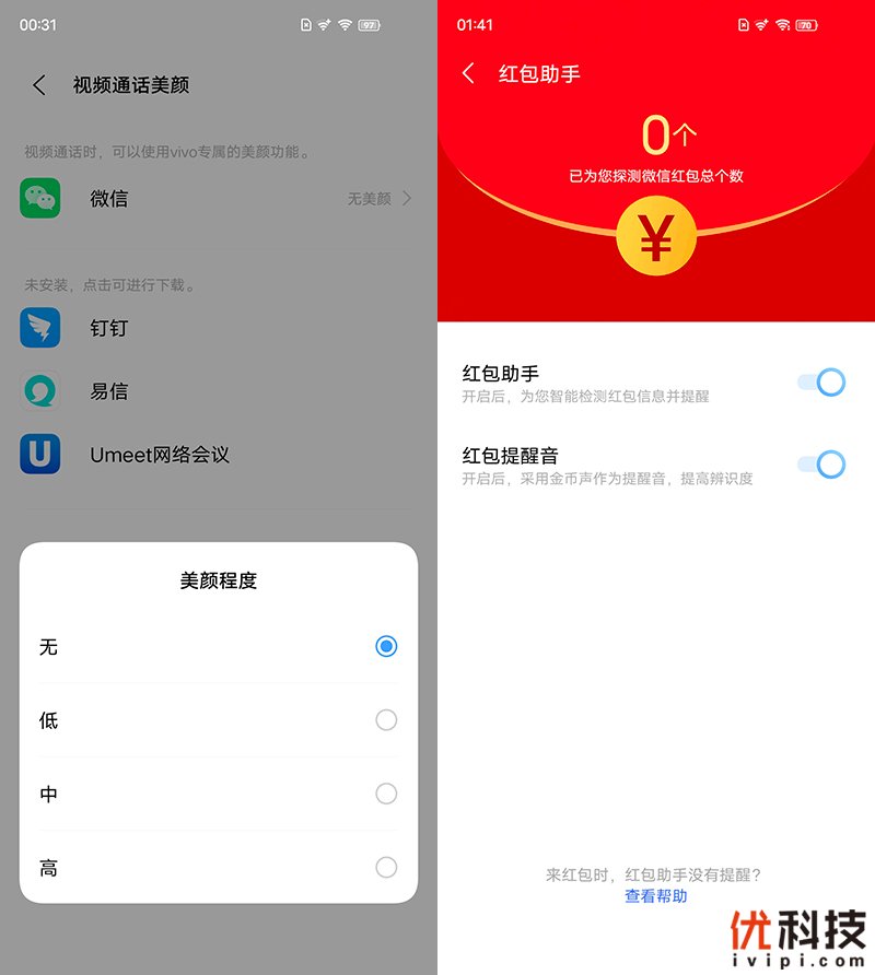 OriginOS内还支持视频通话美颜功能,并且具有多档美颜可选,用户可以轻易的选择适合自己的模式,同时在系统内还支持红包助手功能,开启后即便是用户平时比较忙碌,有红包助手在也不会错过群里的每一个红包。