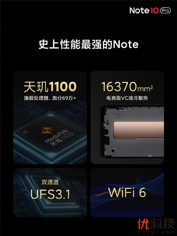 一直以来,中端手机性能羸弱为人所诟病,已经成为体验的最大短板。究其原因,首先在于中端手机标配的中端芯片,其性能紧缺只相当于2-3年前的旗舰机水平;另一方面,软件行业迅速发展领先于硬件行业,反映在体验层面,则是中端手机运行高帧率、高画质游戏相当吃力。基于这一消费者痛点,Redmi首次在中端手机市场下放旗舰芯片,以解决由来已久的性能紧缺难题。旗下Note 10 Pro搭载的旗舰芯天玑1100,与天玑1200采用相同的6nm制程、A78大核、8核架构,只是大核频率略低,安兔兔V9跑分超过69万,运行王者荣耀游戏90帧模式接近满帧。同时,采用旗舰级VC液冷散热,保证长时间的性能稳定输出。