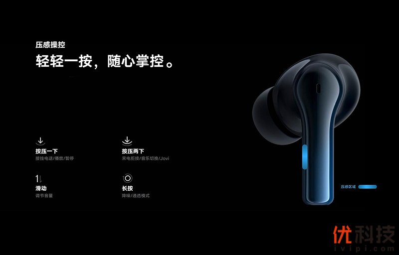 至于耳机的细节设计方面,vivo TWS 2耳机采用了3D人体工学设计,不仅具备较高的佩戴牢固性,而且还提供了更加舒适的佩戴体验。而操控方面vivo TWS 2则是采用了更加实用的压感式操作,vivo TWS 2内置了精密的压力传感器,用户通过按压耳机柄即可实现控制操作,如接挂电话、音乐切换、手机助手唤醒以及降噪模式切换等,操控起来非常的方便,同时还支持滑动调节音量功能,用户也不必通过手机的音量键来调节了。