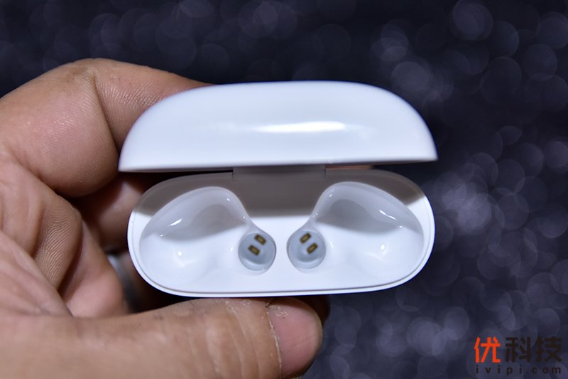 电池仓内部耳机位置底部配有两颗金属充电触点,并且同样采用了磁吸式设计,即便电池仓上盖开启,位于其中的耳机主体也不会掉落。