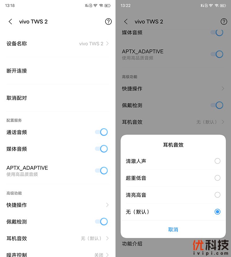 之后即可在手机设置的蓝牙功能中进入到vivo TWS 2的相关设置页面了,例如APTX_ADAPTIVE高品质音频功能以及佩戴检测和耳机音效都有着非常丰富的选择。