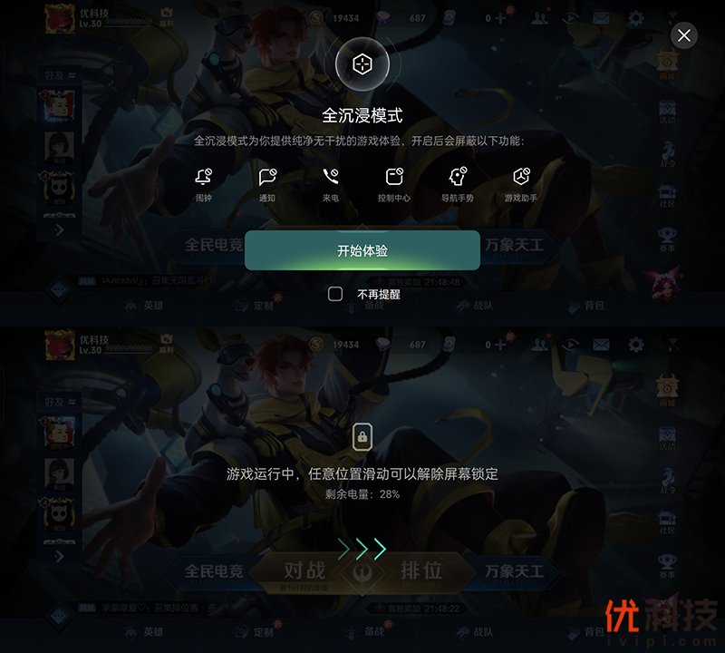并且还支持全沉浸模式,开启后将会屏蔽闹铃、通知、来电、控制中心、导航手势以及游戏助手。同时还支持屏幕锁定挂机功能,一些养成类游戏都可以通过锁屏挂机来使用,在不影响日常的同时还能够节省一定的功耗。