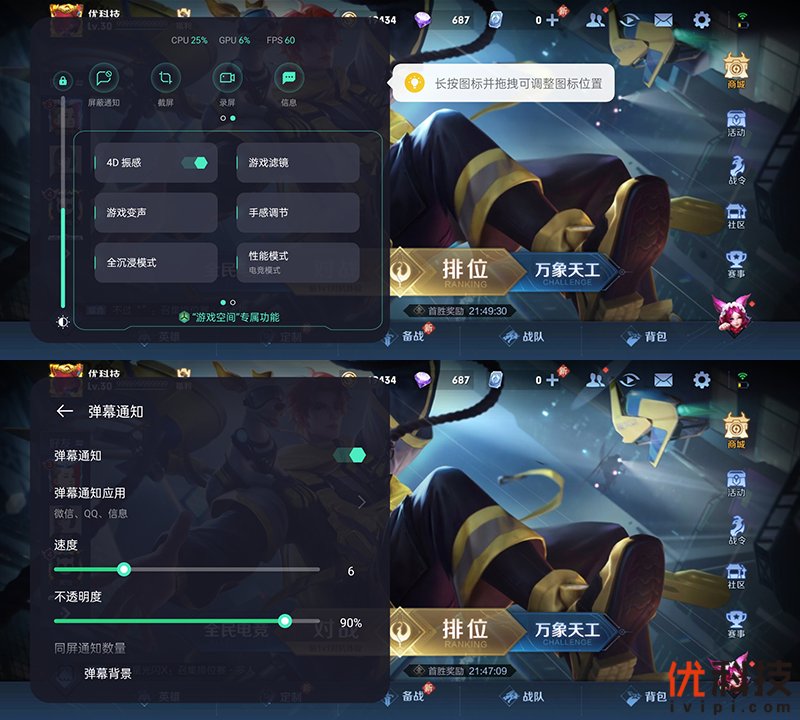 而在游戏页面滑动屏幕的左上角即可呼出游戏助手,游戏助手的功能也是非常的全面,不仅支持屏蔽消息和拒接来电,还显示手机的实时运行状态,同时长按图标还可以调整图标位置,便于用户的使用习惯。同时弹幕通知也是非常得有趣,不会过多地占用游戏页面空间,同时还支持弹幕的速度和不透明度以及同屏通知数量的调整。