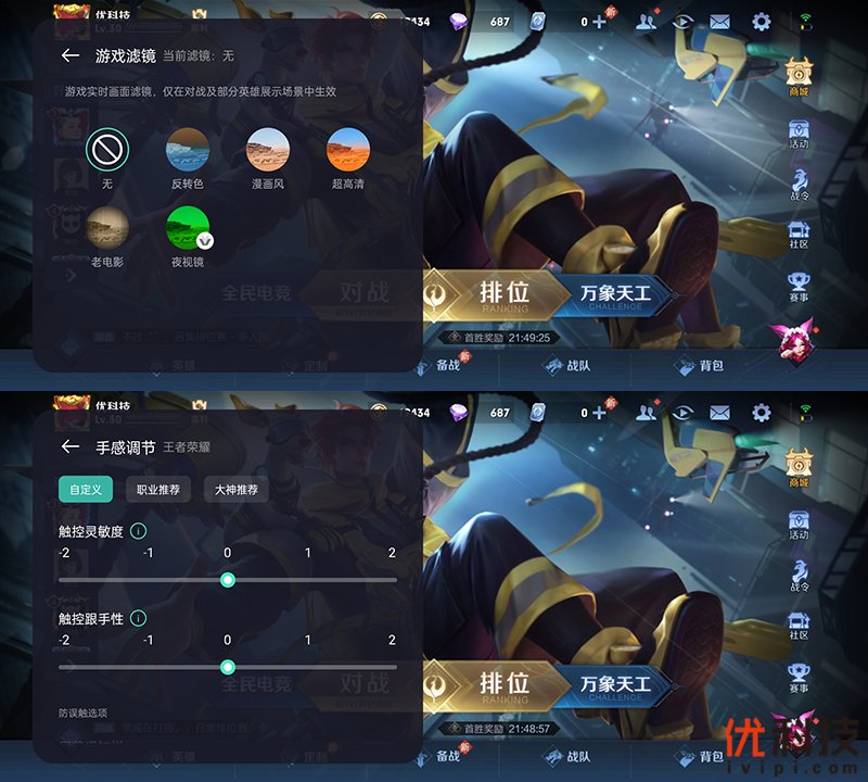 另外在游戏助手中还可以选择游戏滤镜功能,内置了5种滤镜可选,可以有效地提升对战时场景体验,同时还支持手感调节功能,并且可以根据不同的游戏来设定不同的灵敏度和跟手性,另外还提供了职业推荐和大神推荐功能。