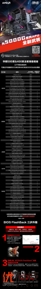 AMD锐龙5000G系APU即将开售,除了以上三款华硕B550主板外,还有更多华硕400系和500系主板可升级至1108及更新版本的BIOS以支持锐龙5000G系列处理器。详细产品列表及BIOS可见下表,相信肯定有一款主板可满足你的需求。