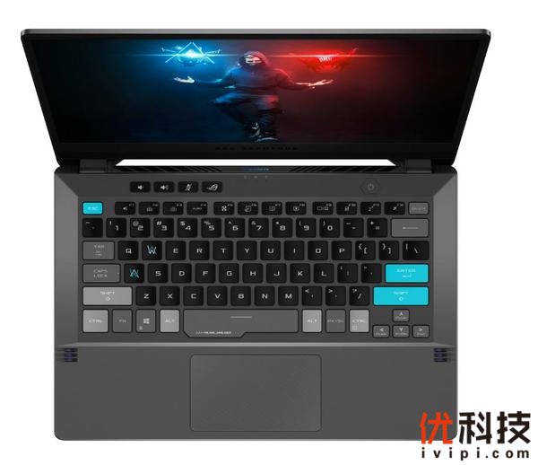 打开电脑后,更多定制细节印入眼帘。C面键盘由独特的颜色风格拼合而成,A键和W键为Alan Walker LOGO定制键帽,空格键上还有</ROG> X Alan Walker的合作标识,充满各种设计细节。触控板上还有特殊的斜纹式设计,蕴含能量流转的动感。