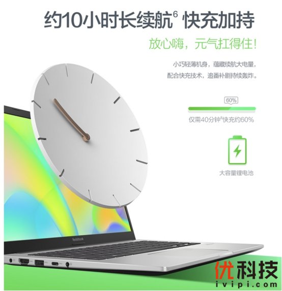 小身材大能量,40分钟即可充电支持60%以上电量,带来活力满满,Redolbook14搭载大电池可带来长达约10小时的续航能力,足以应对一整天工作,还支持高效快充技术,无惧断电,快充快用!