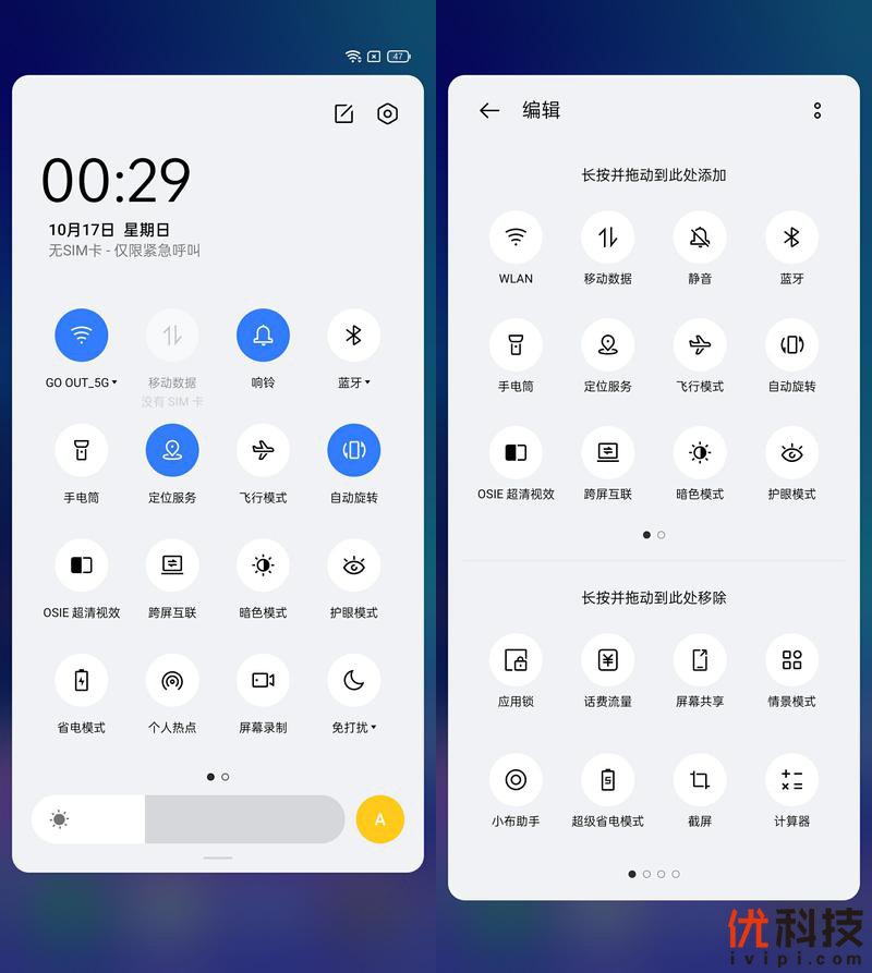 realme UI的快捷按钮功能也是非常的全面,采用了两段式设计,默认顶层部分为常用功能,下拉则是启用全屏状态,并且集成了常用的亮度调节功能,同时还支持自定义排序,用户可以根据自己的喜好来设定。