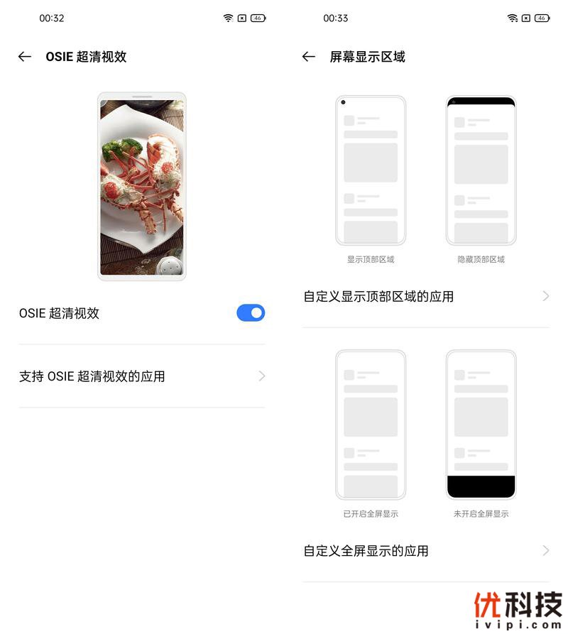 此外OSIE超清视效功能依旧支持,不仅在观看视频的时候更加得生动,对于视频的视觉效果提升还是非常大的。并且可支持的软件也是非常得丰富。另外还支持设定屏幕显示区域功能,支持自定义显示顶部区域的应用以及全面显示的应用。