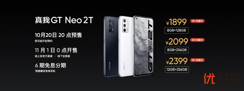 真我GT Neo2T提供 8GB+128GB 版售价为2099元,首发价直降100元为1999元。8GB+ 256GB 、12GB +256GB两个版本首发价分别为2199元、2499元。在双11期间,三个版本的双11惊喜价分别为1899元、2099元、2399元,首销用户可享受6期免息分期。